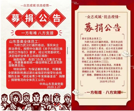 1月27日起,圣奥化学通过多种方式向灾区伸出援助之手,截止2月6日为湖北疫区、连云港徐圩新区人民医院捐款共94,821元,捐赠500只防护口罩、6箱消毒湿巾。其中,山东圣奥与泰安圣奥分别通过山东省青少年发展基金会和湖北省青少年发展基金会向湖北疫区捐款,其他子公司也正在筹划、组织募捐活动。