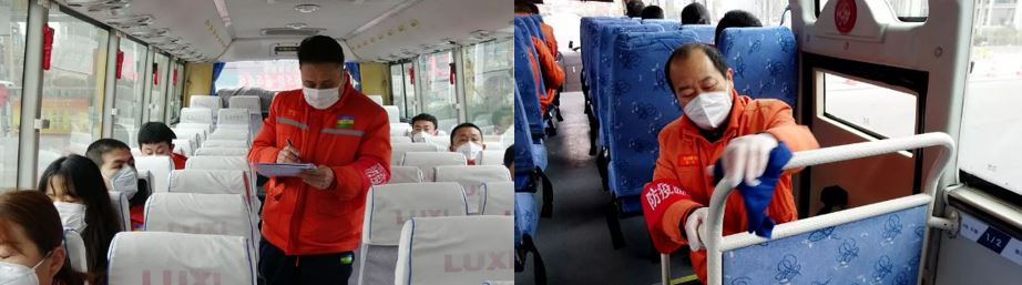 鲁西化工建立了“通勤班车管理干部监督服务岗“,总部副处级以上管理干部主动请缨,每天专人专车做好人员登记、消毒工作,为广大员工营造安全、放心的乘车环境。