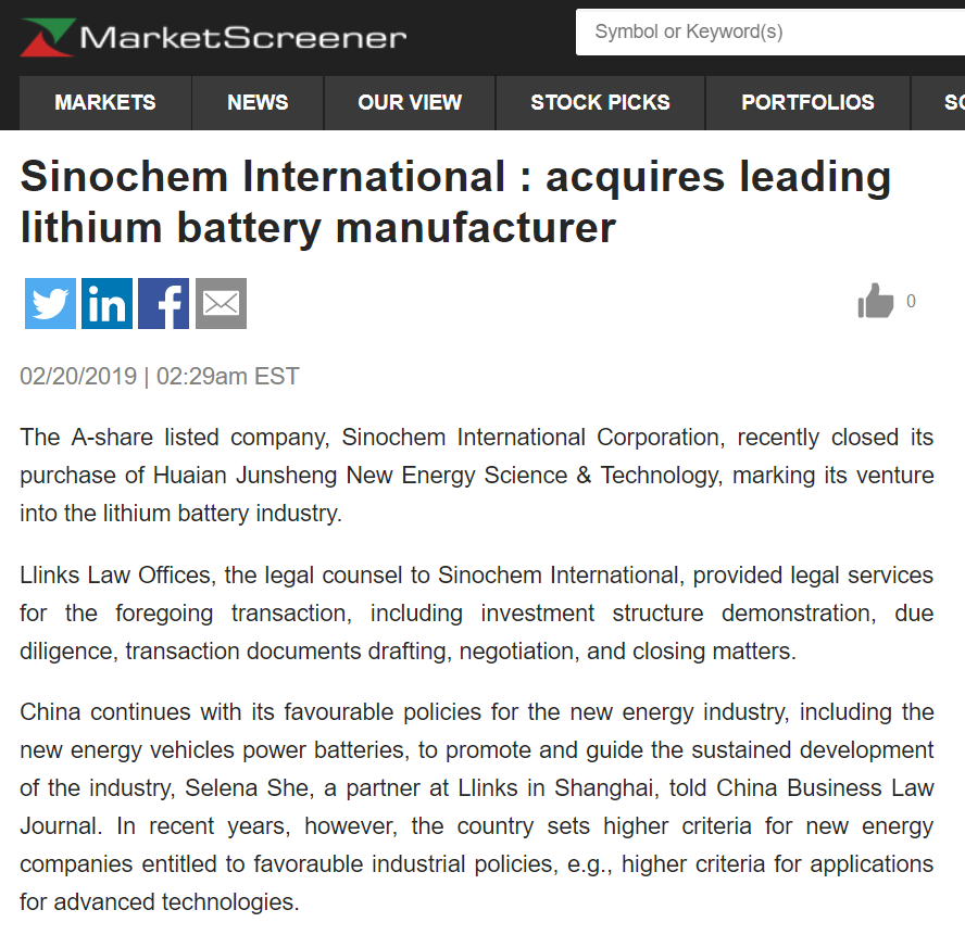 Sinochem International: Acquires Leading Lithium Battery Manufacturer